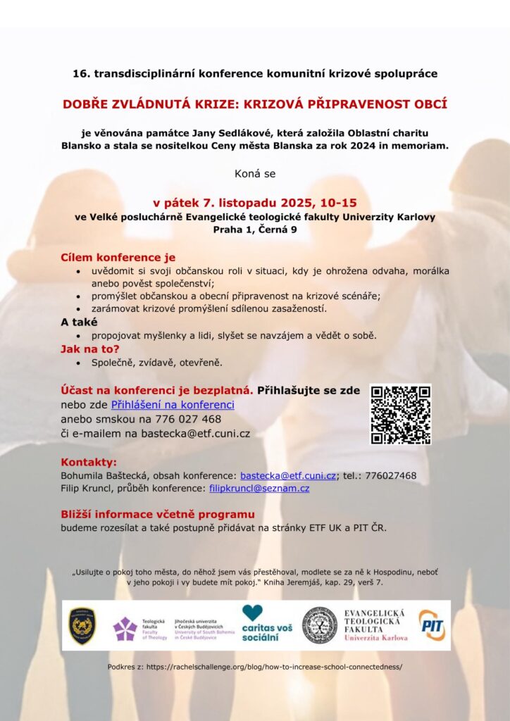 Již 13. transdisciplinární konference komunitní krizové spolupráce proběhne v pátek 11. 11. 2022 na Evangelické teologické fakultě UK v Praze. Pod názvem „Všichni jsme břemena a nosiči“ se bude zabývat zkušenostmi pandemie, tornáda a války.