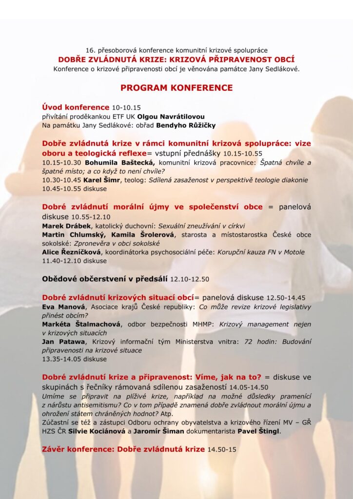 Konferenci pořádá Evangelická teologická fakulta Univerzity Karlovy a Psychosociální intervenční tým České republiky ve spolupráci s Teologickou fakultou Jihočeské univerzity v Českých Budějovicích, Caritas – VOŠ sociální v Olomouci, Diakonií Českobratrské církve evangelické, Psychologickou službou Generálního ředitelství Hasičského záchranného sboru MV ČR.